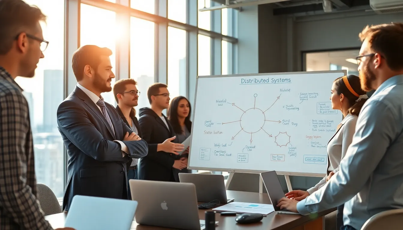 diverse IT team discussing distributed systems in a modern office.